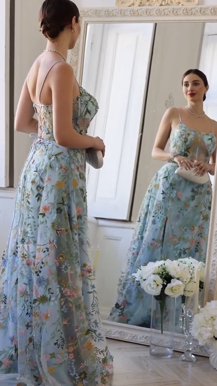 Blue Flower A Line Spaghetti Straps Corset Embroidered Prom Dress with Slit