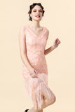 Beaded Pink Fringed Flapper Dress with 1920s Accessories Set