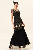 Black and Golden Cap Sleeves Sequined Long 1920s Gatsby Flapper Dress with 20s Accessories Set