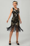 Bodycon Halter Black Golden Sequin 1920s Dress With Fringes