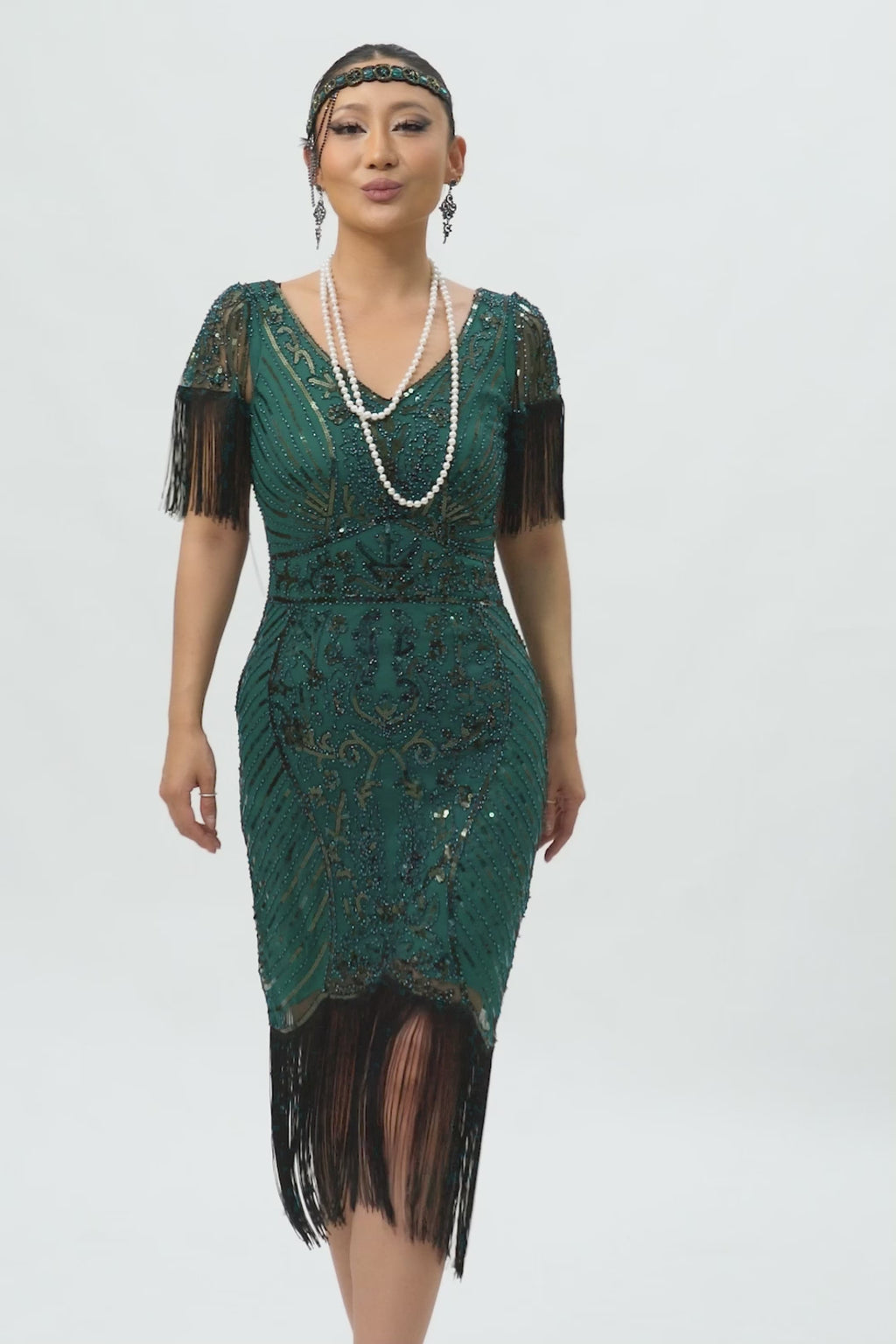 Dark Green Sequined Bodycon Fringed 1920s Dress With Short Sleeves