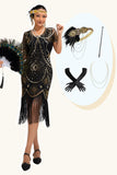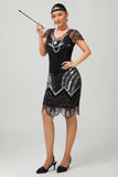 Sequin Black Silver Beaded Short 1920s Dress with 5 Piece Accessory Set