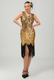Sparkly Black Golden V Neck Bodycon 1920s Dress with Fringes
