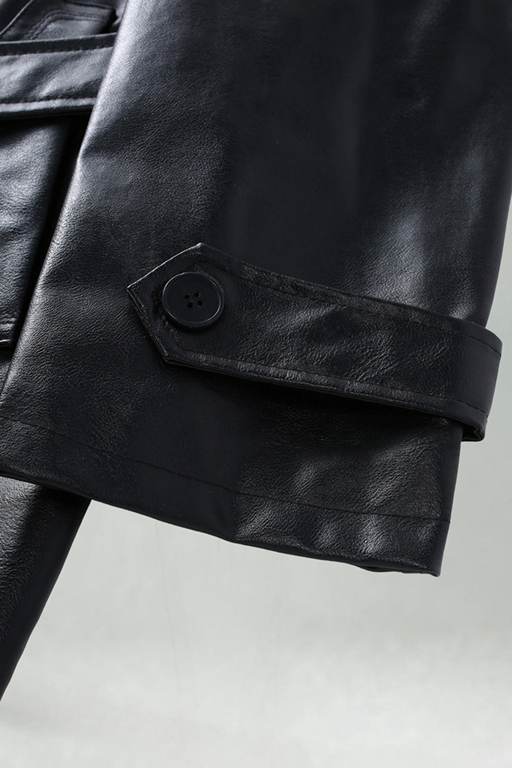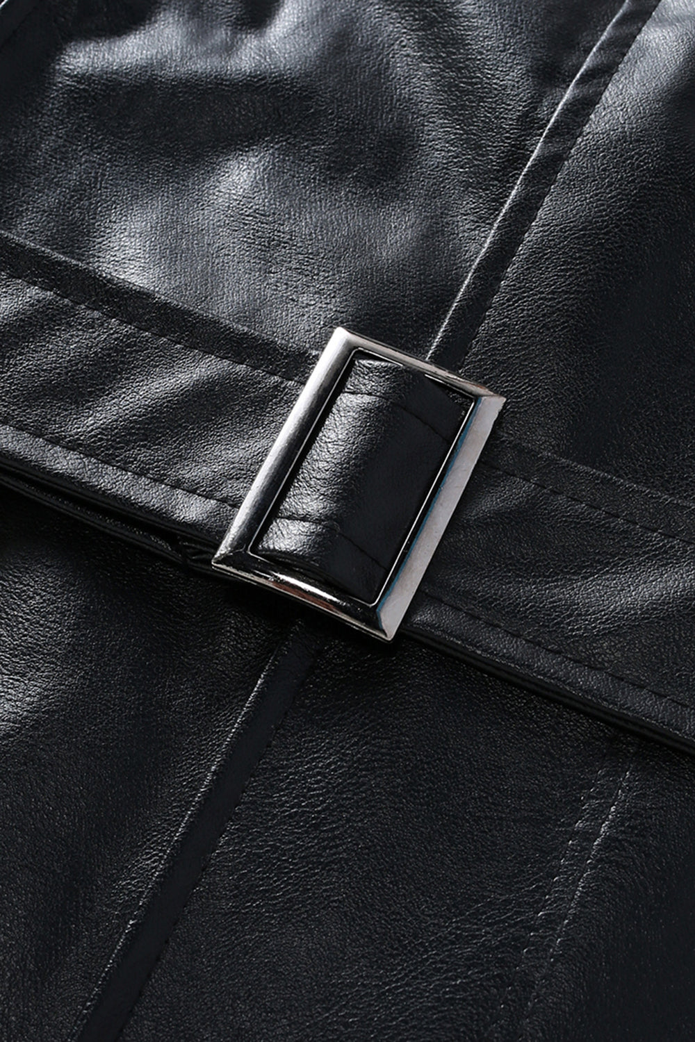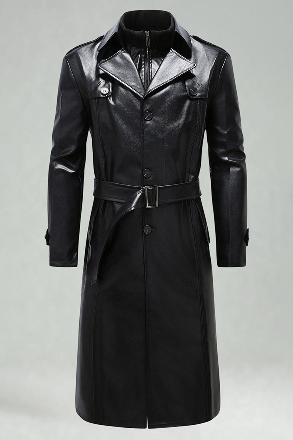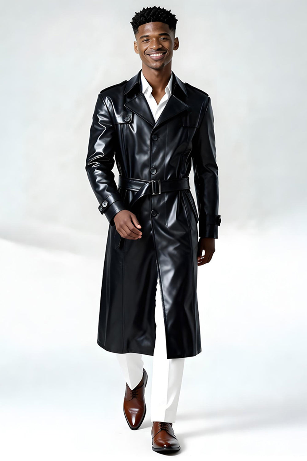 Black Leather Notched Lapel Men's Trench Coat with Belt