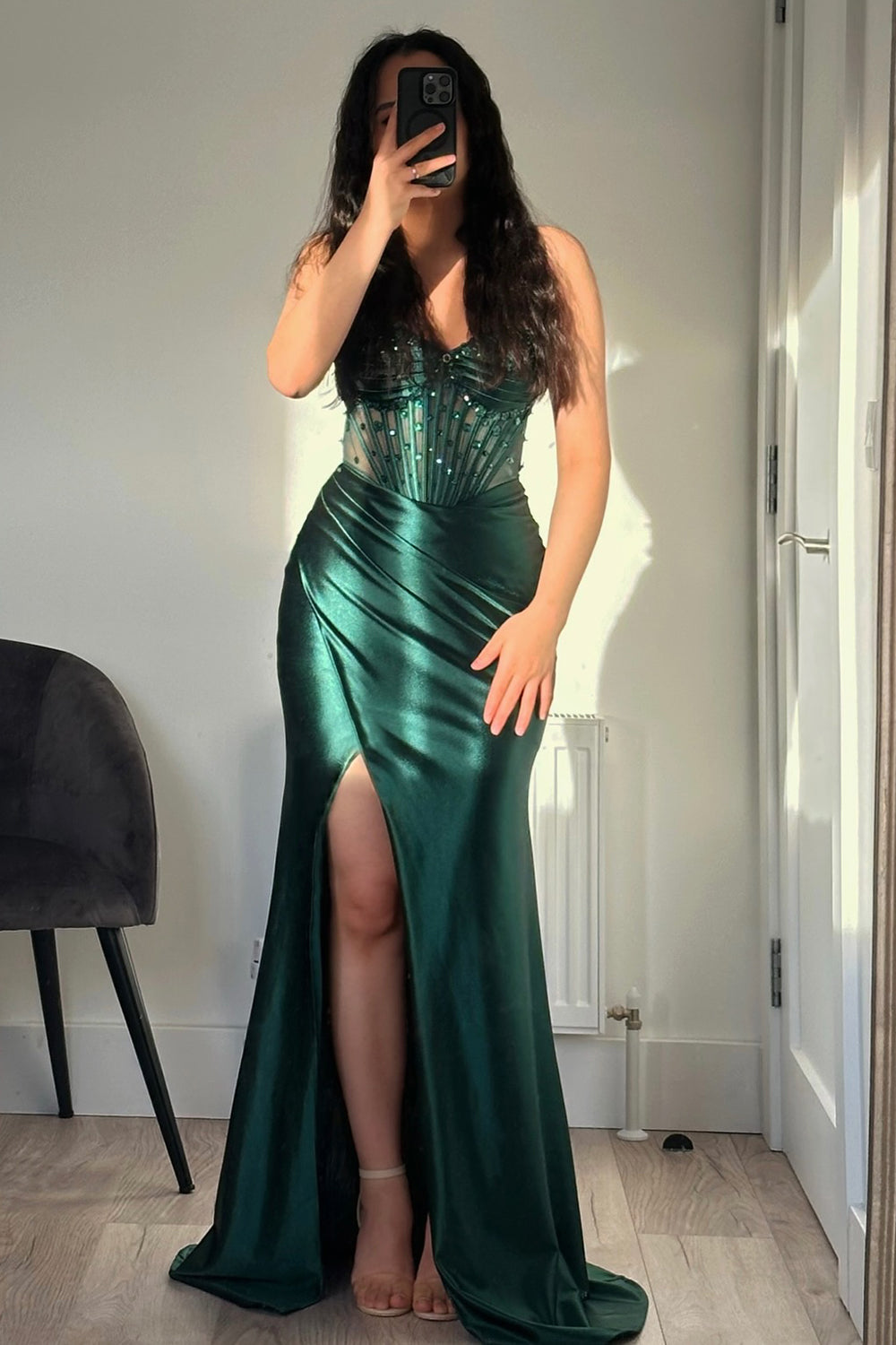 Sparkly Dark Green Mermaid Strapless Beaded Corset Long Prom Dress with Slit