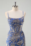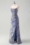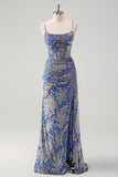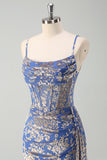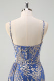 Blue Burnout Floral Mermaid Spaghetti Straps Corset Bridesmaid Dress with Slit