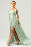 Dusty Sage Square Neck Printed Flower Long Bridesmaid Dress with Slit