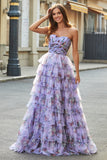Gorgeous A Line Off the Shoulder Lavender Printed Long Prom Dress with Ruffles