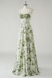 Green Flower A-Line Spaghetti Straps Ruched Corset Long Bridesmaid Dress