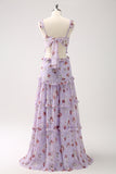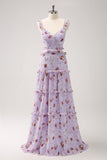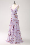 Grey Purple A-Line Off the Shoulder Floral Bridesmaid Dress
