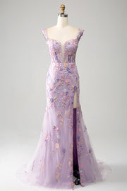 Light Purple Off The Shoulder Long Embroidered Mermaid Prom Dress Slit