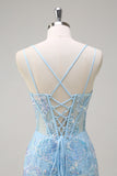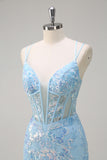 Sparkly Blue Mermaid Spaghetti Straps Sequin Corset Long Prom Dress with Embroidery