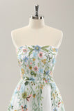 White A Line Strapless 3D Flowers Tulle Wedding Dress with Slit