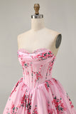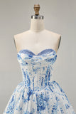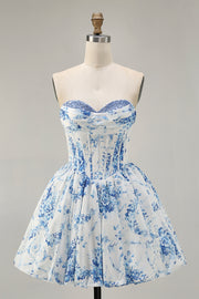Strapless White Blue Flower A-Line Printed Homecoming Dress with Beading