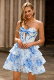 White Blue Flower Strapless Tiered Corset Homecoming Dress