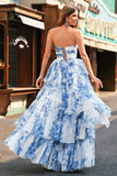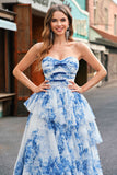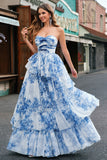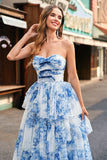 White Blue Flower A-Line Strapless Tiered Long Prom Dress with Bows