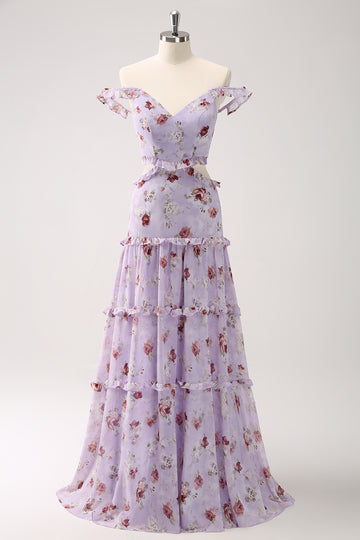 Grey Purple A-Line Off the Shoulder Floral Bridesmaid Dress