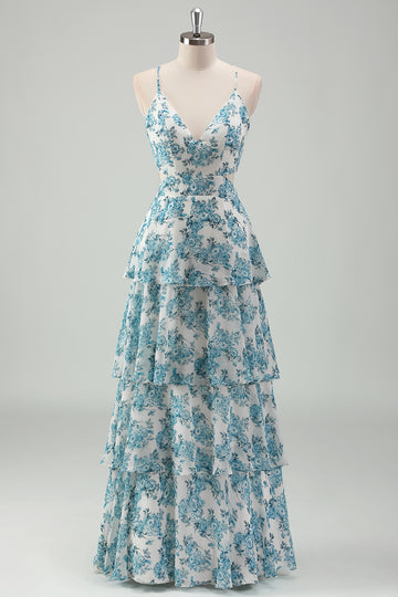 Blue Printed A Line Tiered Hollow-out Long Prom Dress