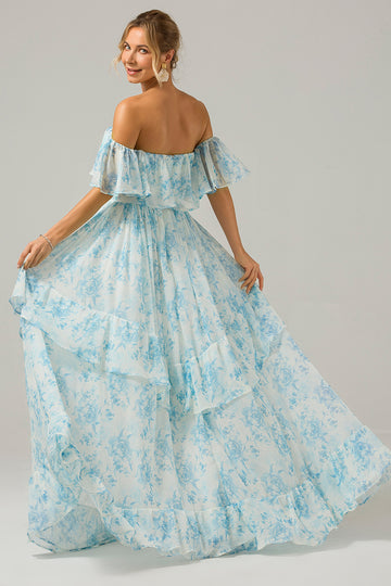 White Blue Floral Off The Shoulder Boho Long Bridesmaid Dress with Ruffles