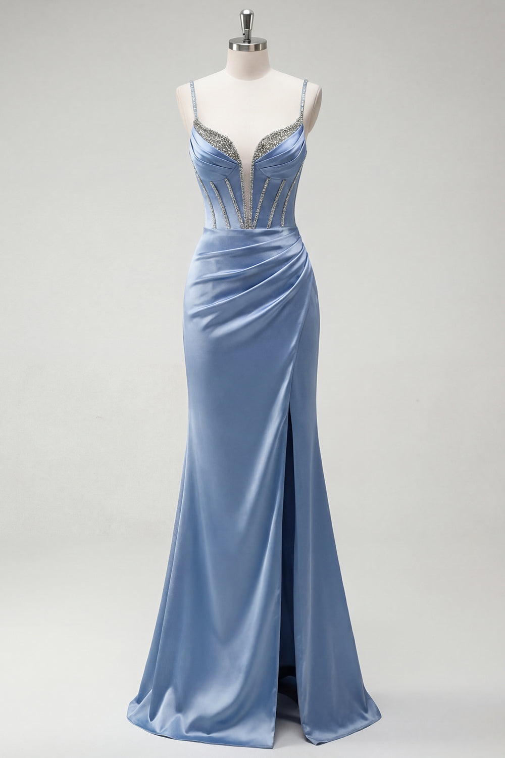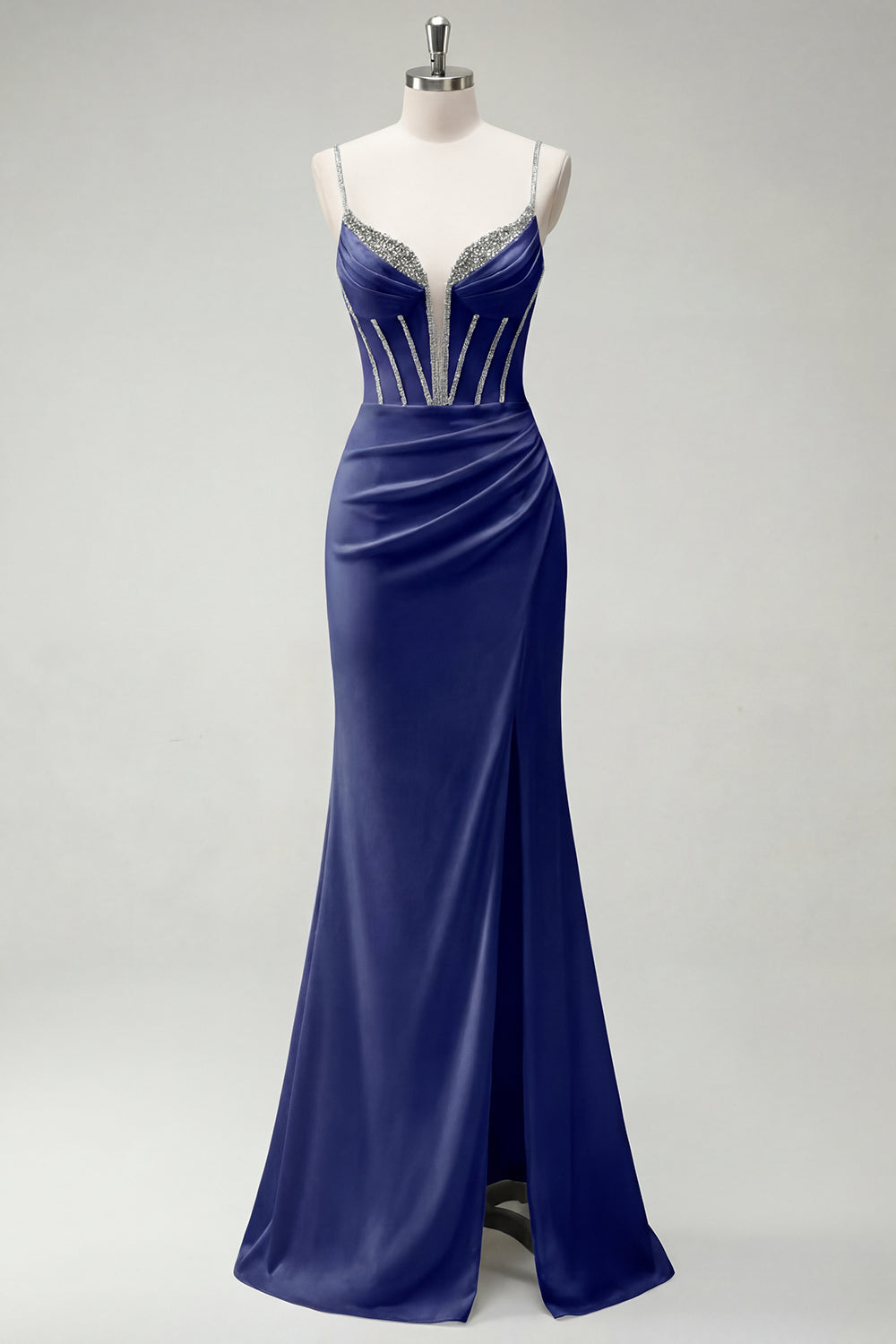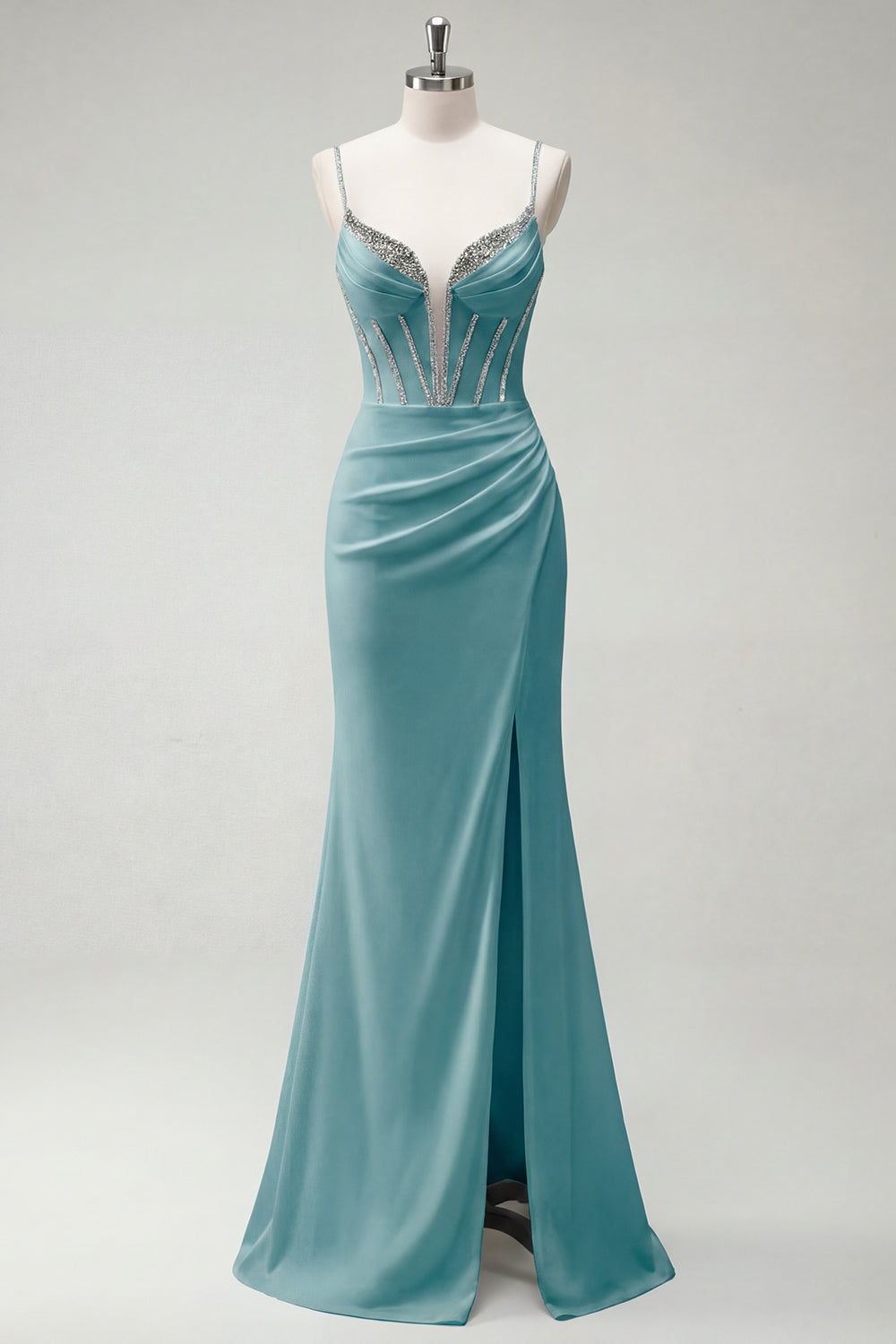Black Mermaid Spaghetti Straps Corset Long Prom Dress With Slit