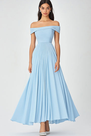 Off the Shoulder Sky Blue A Line Ruched Chiffon Formal Dress
