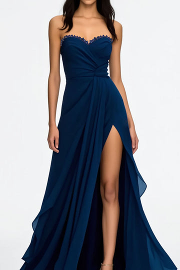 Elegant Navy Ruffled A Line Sweetheart Formal Dress with Slit