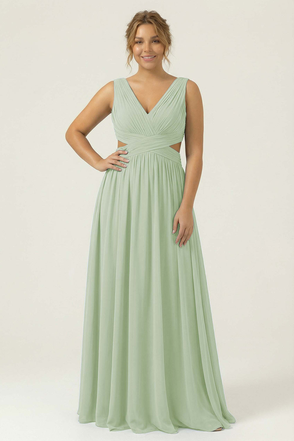 Dusty Blue Chiffon V Neck A Line Long Plus Size Bridesmaid Dress with Lace Up Back