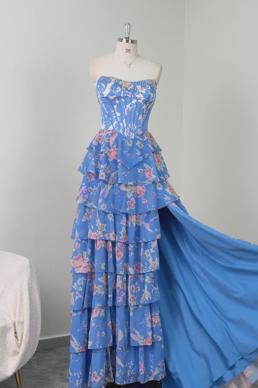 Dark Blue Strapless A-line Tiered Corset Bodice Floral Long Prom Dress with Chiffon Ruffle Skirt