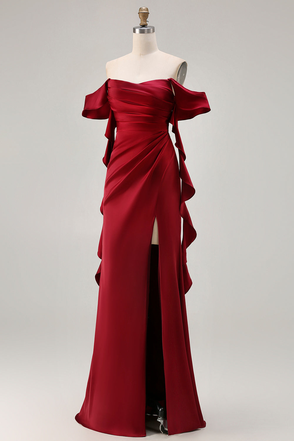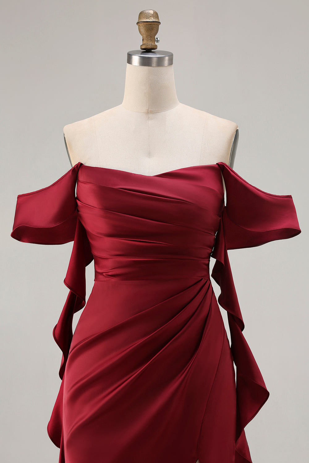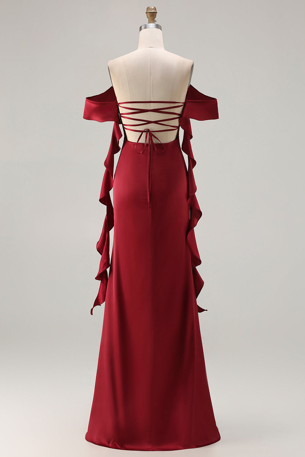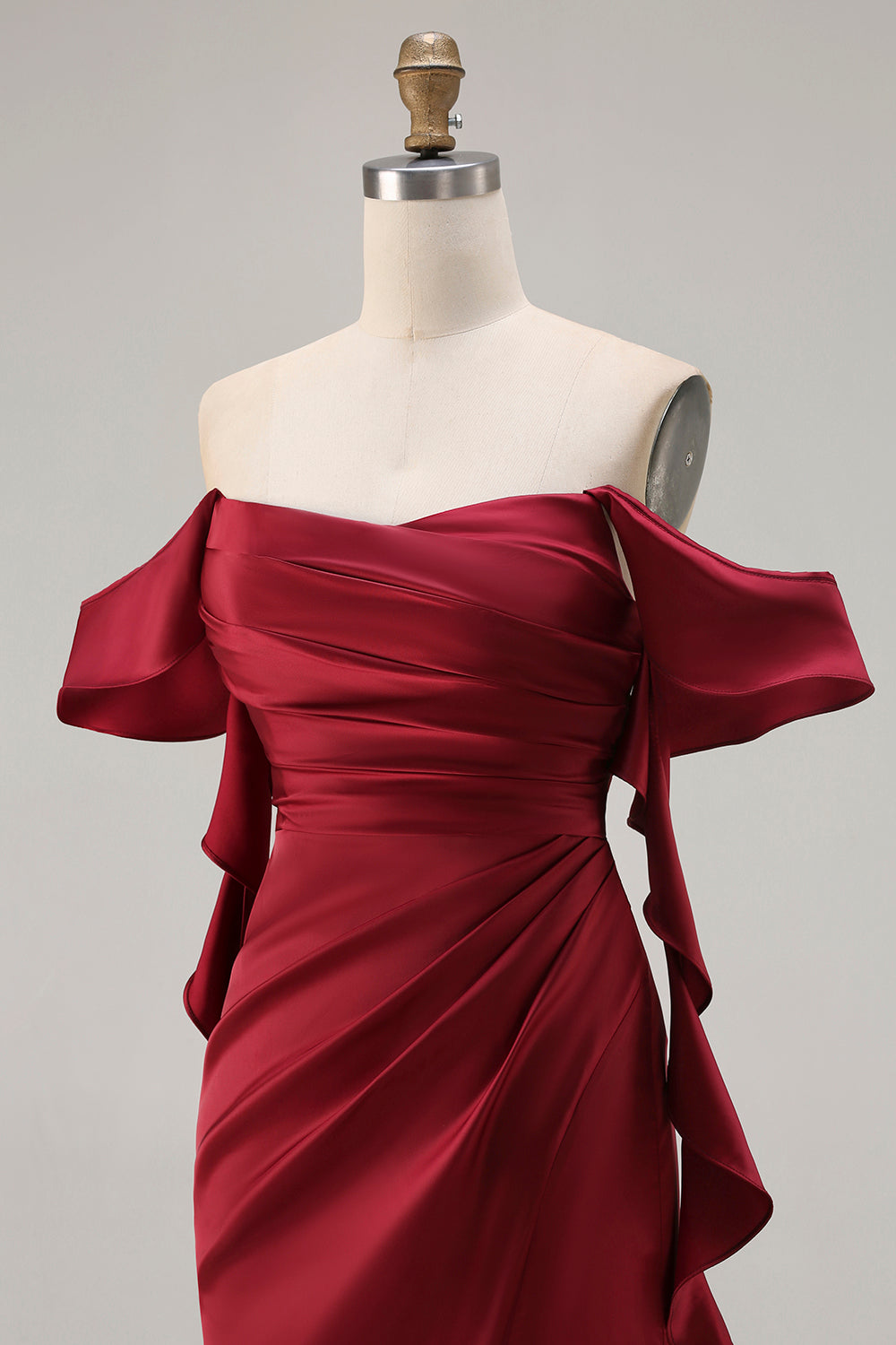 Burgundy Off The Shoulder Mermaid Satin Long Bridesmaid Dress with Slit