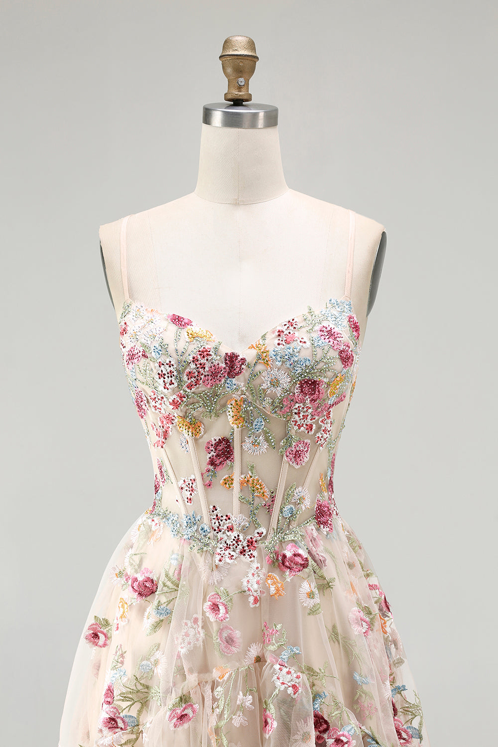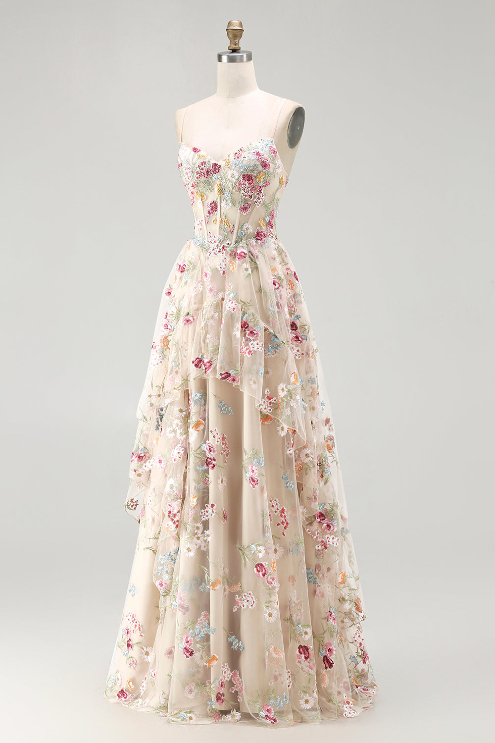 Ivory A Line Sheer Boned Corset Embroidered Long Floral Dress with Ruffled Slit