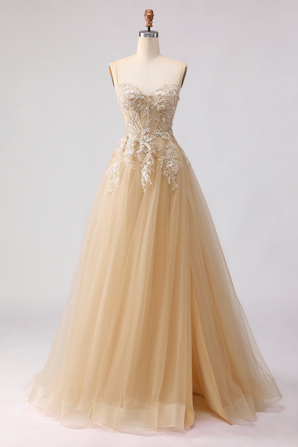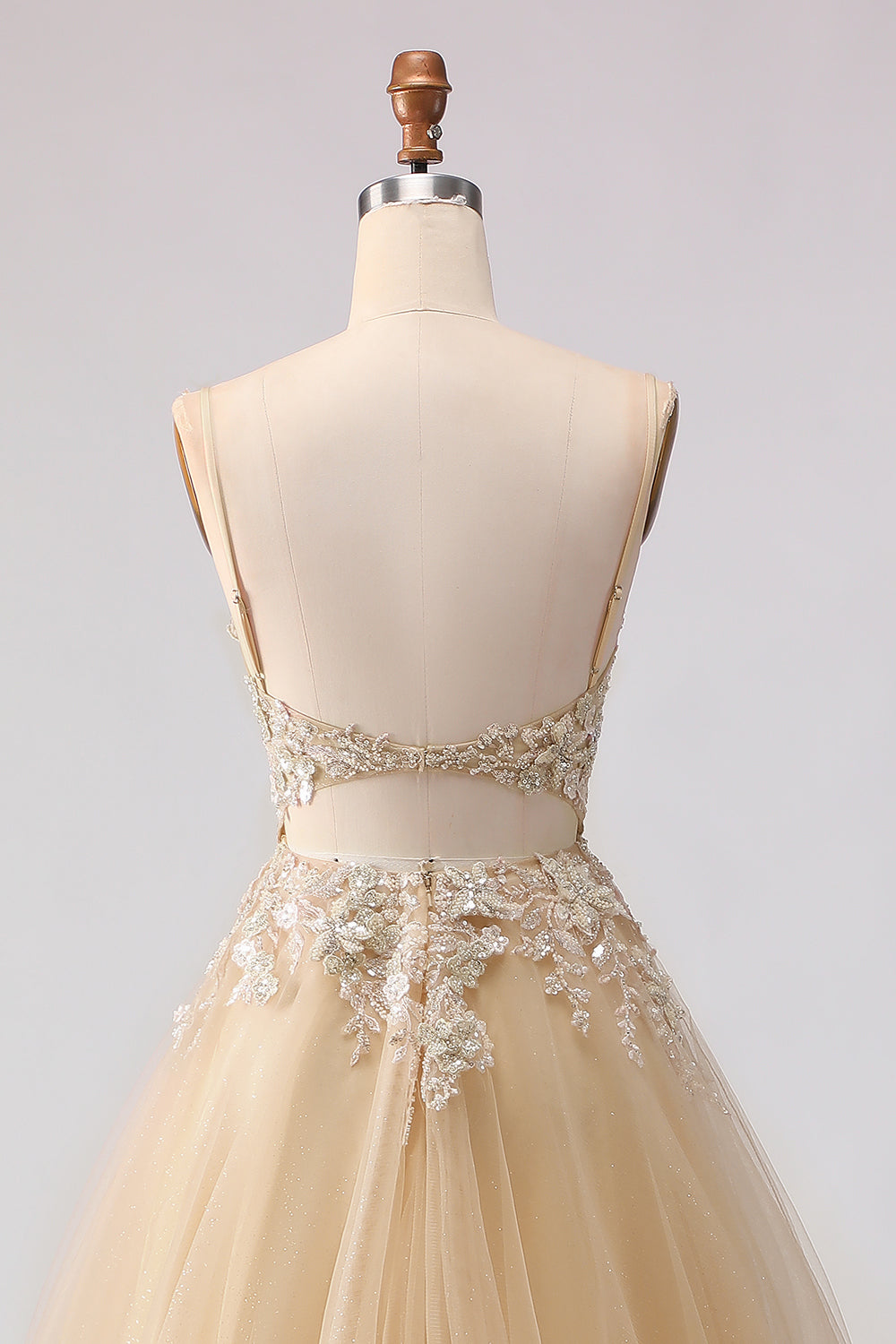 Sparkly A-Line Tulle Beaded Embroidered Champagne Long Prom Dress with Slit
