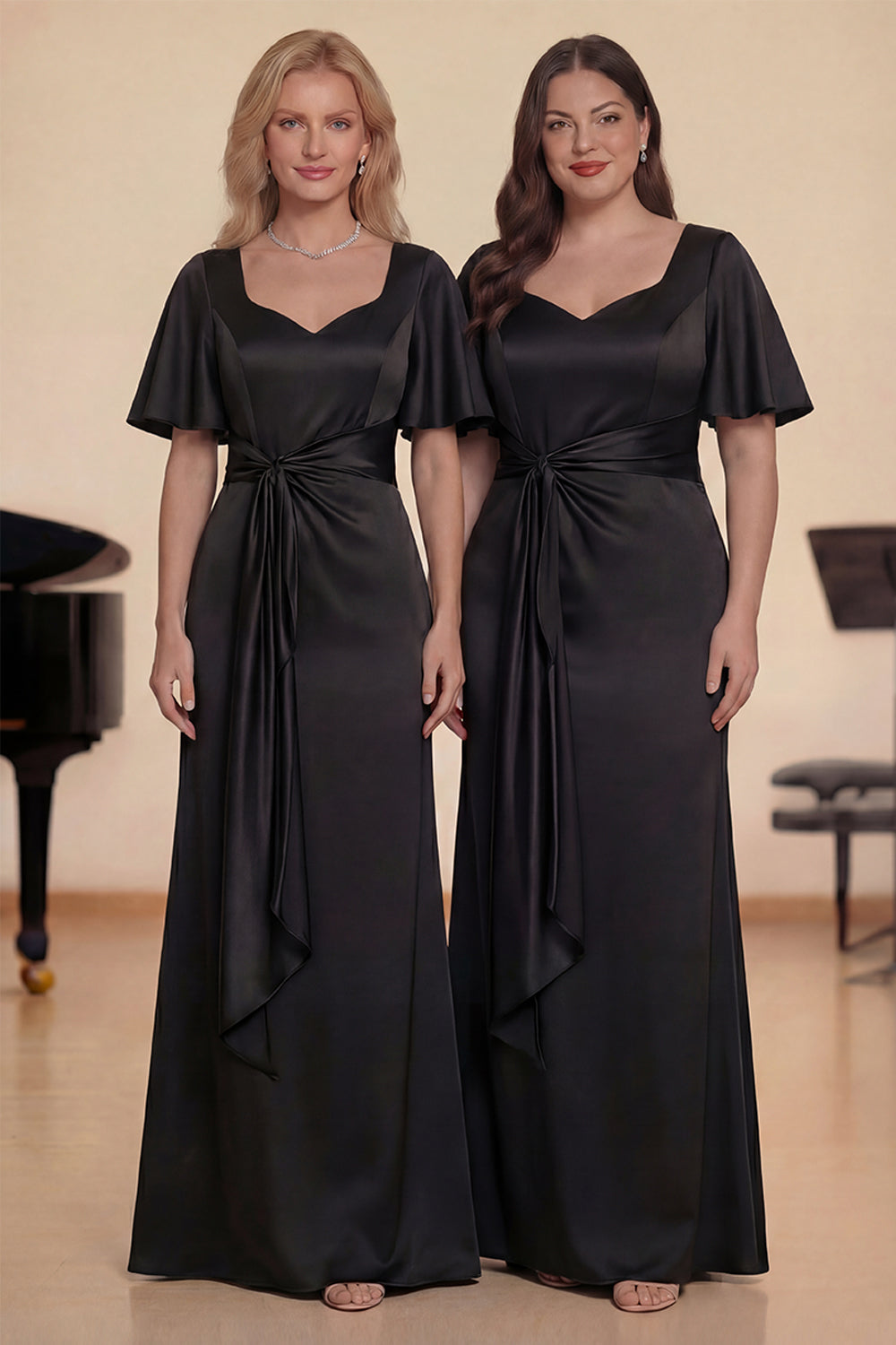 Black Satin A-Line Short Sleeves Ruched Choir Dress with Sash
