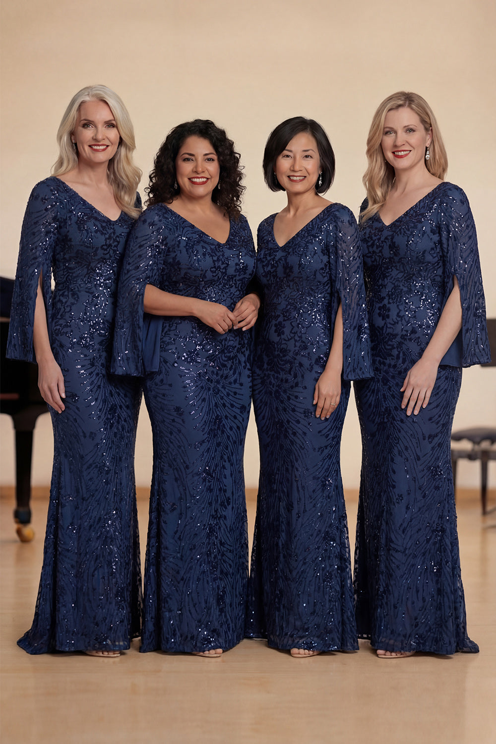 Glitter Navy Mermaid V Neck Sequins Long Choir Dress with Cape Sleeves
