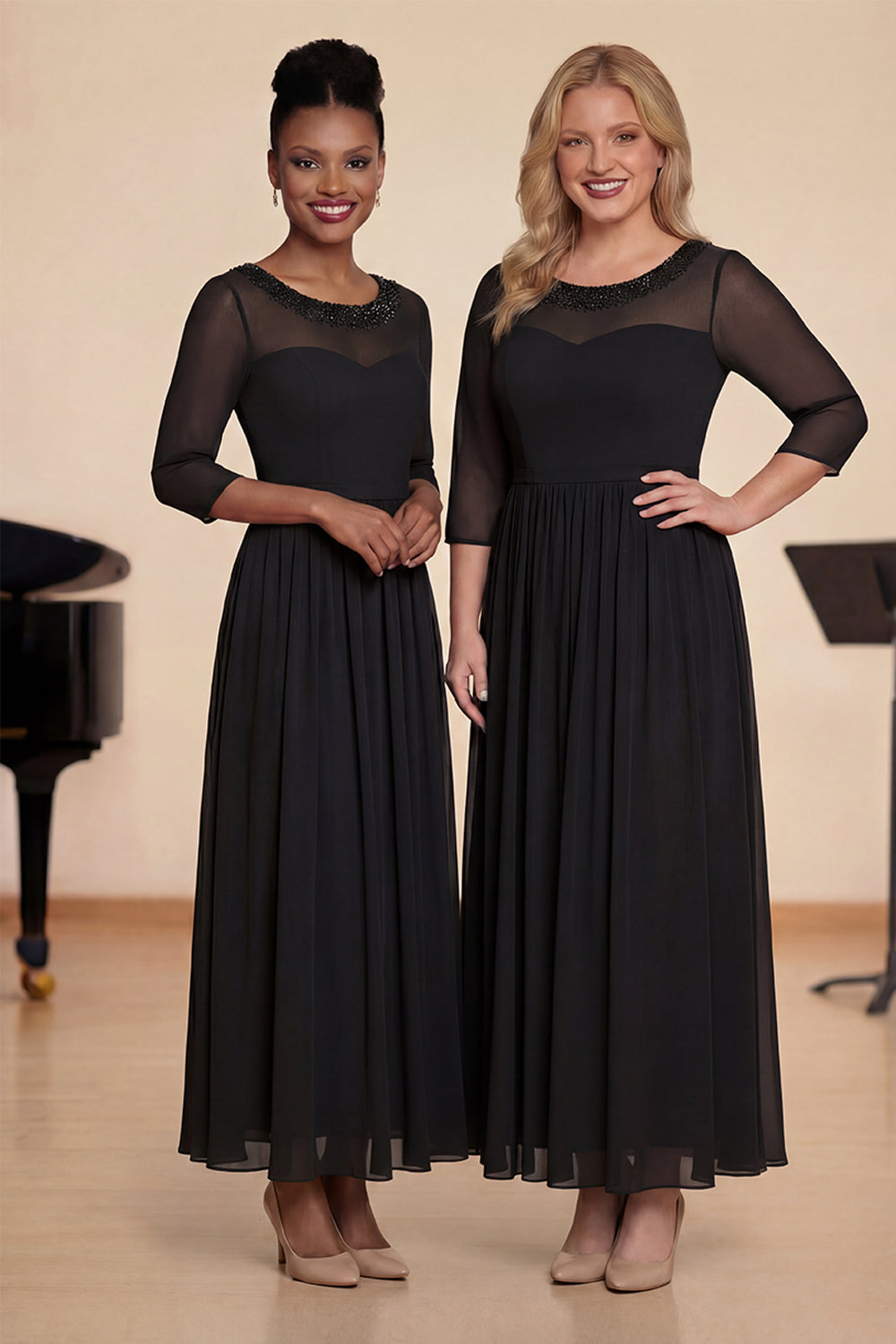 Navy Beaded A Line Boat Neck Long Choir Dress with Half Sleeves