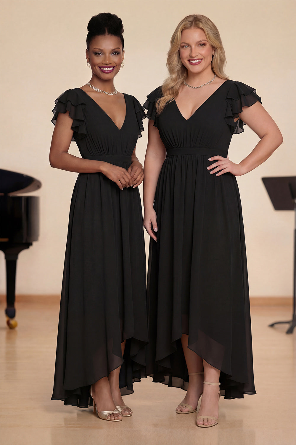 Navy Chiffon A-Line V-Neck Choir Dress with Flutter Sleeves