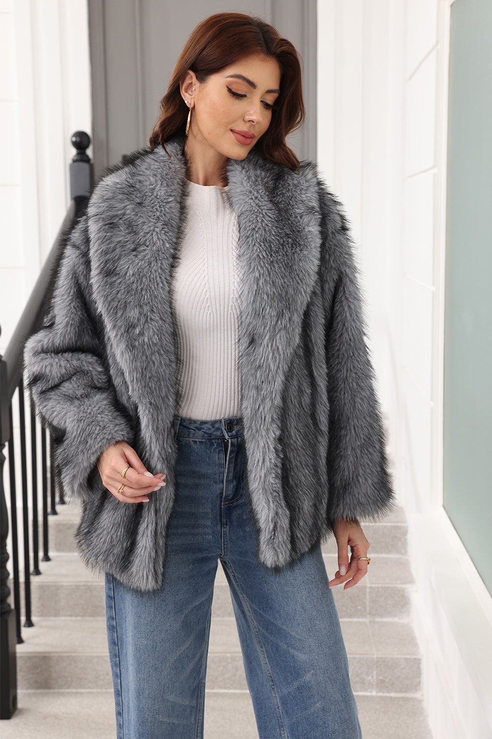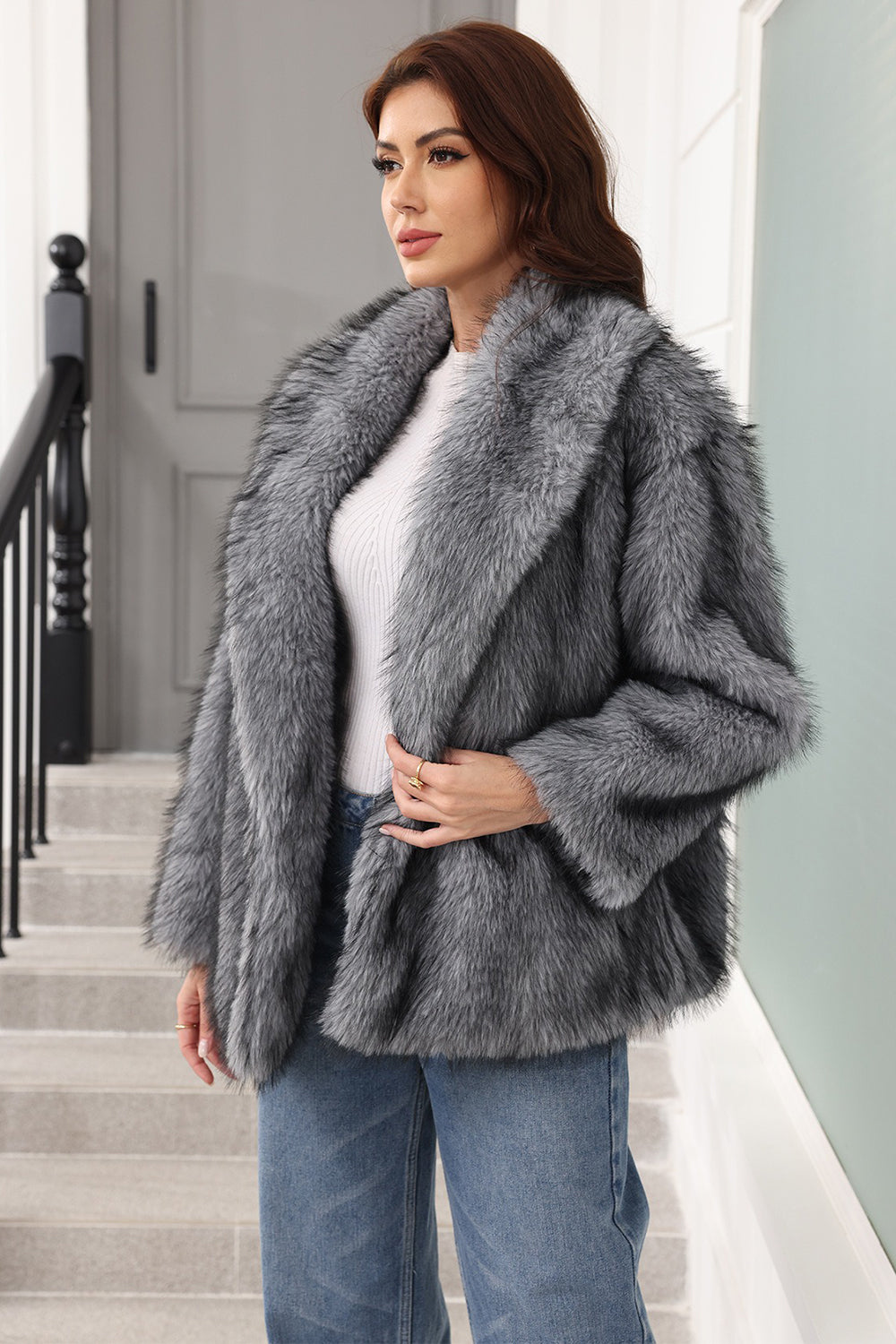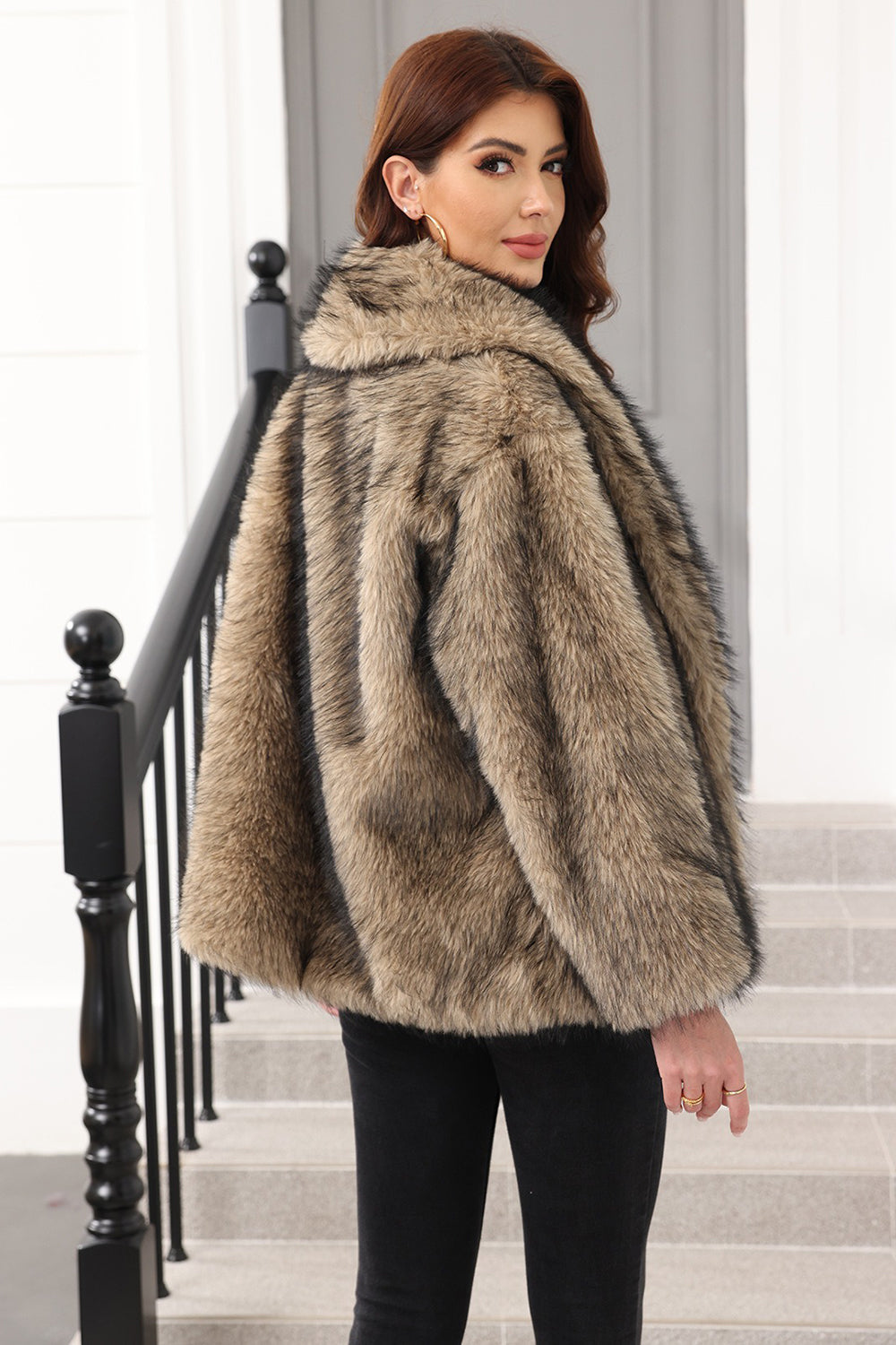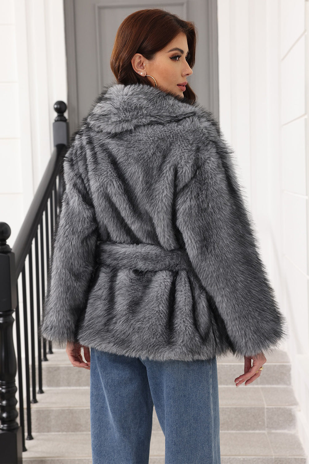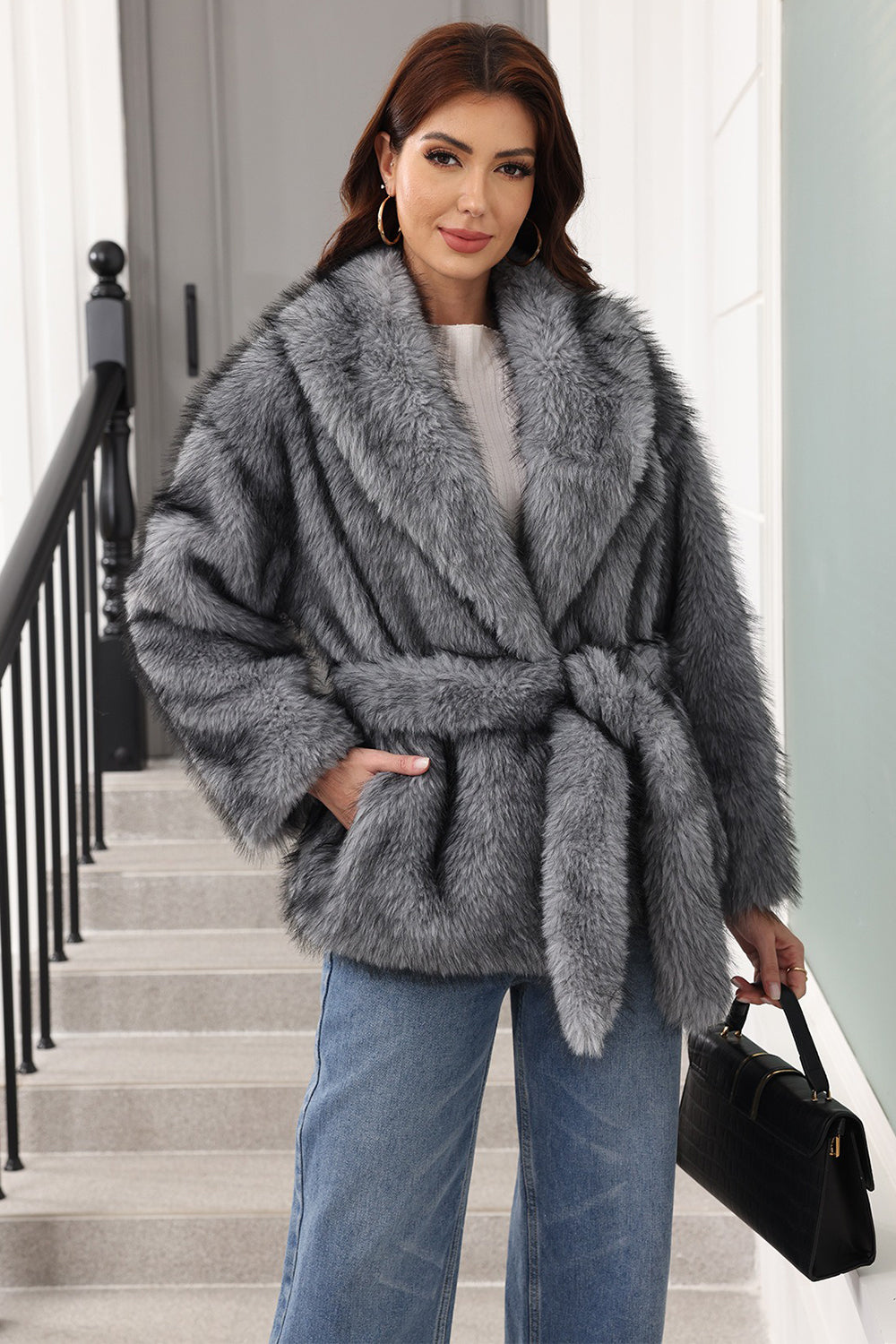Coffee Faux Fur Shawl Lapel Women Coat with Belt