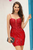 Bodycon Spaghetti Straps Red Sequins Short Homecoming Dress with Criss Cross Back