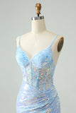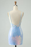 Glitter Light Blue Tight Spaghetti Straps Short Homecoming Dress with Sequins