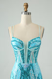 Sparkly Blue Bodycon Spaghetti Straps Corset Homecoming Dress with Sequins