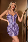 Sparkly Dark Purple Spaghetti Straps Corset Short Unique Homecoming Dress with Sequins