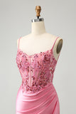 Sparkly Pink Tight Corset Spaghetti Straps Homecoming Dress with Appliques