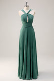 Eucalyptus A Line Halter Neck Chiffon Pleated Long Bridesmaid Dress