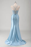 Blue Mermaid Corset Spaghetti Straps Appliqued Long Prom Dress