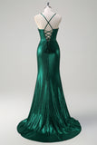 Glitter Dark Green Mermaid Corset Ruched Metallic Prom Dress with Slit