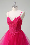 Hot Pink Appliques Corset Spaghetti Straps A Line Spiral Ruffles Prom Dress