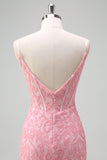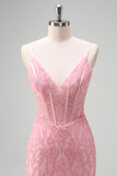 Sparkly Light Pink Mermaid V-Neck Corset Sequin Prom Dress with Slit