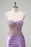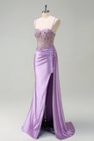Sparkly Purple Mermaid Watteau Train Sheer Ruched Corset Long Prom Dress with Slit