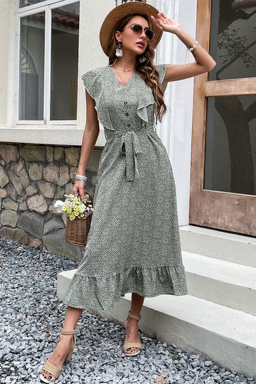 V Neck Green Printed Summer Dress