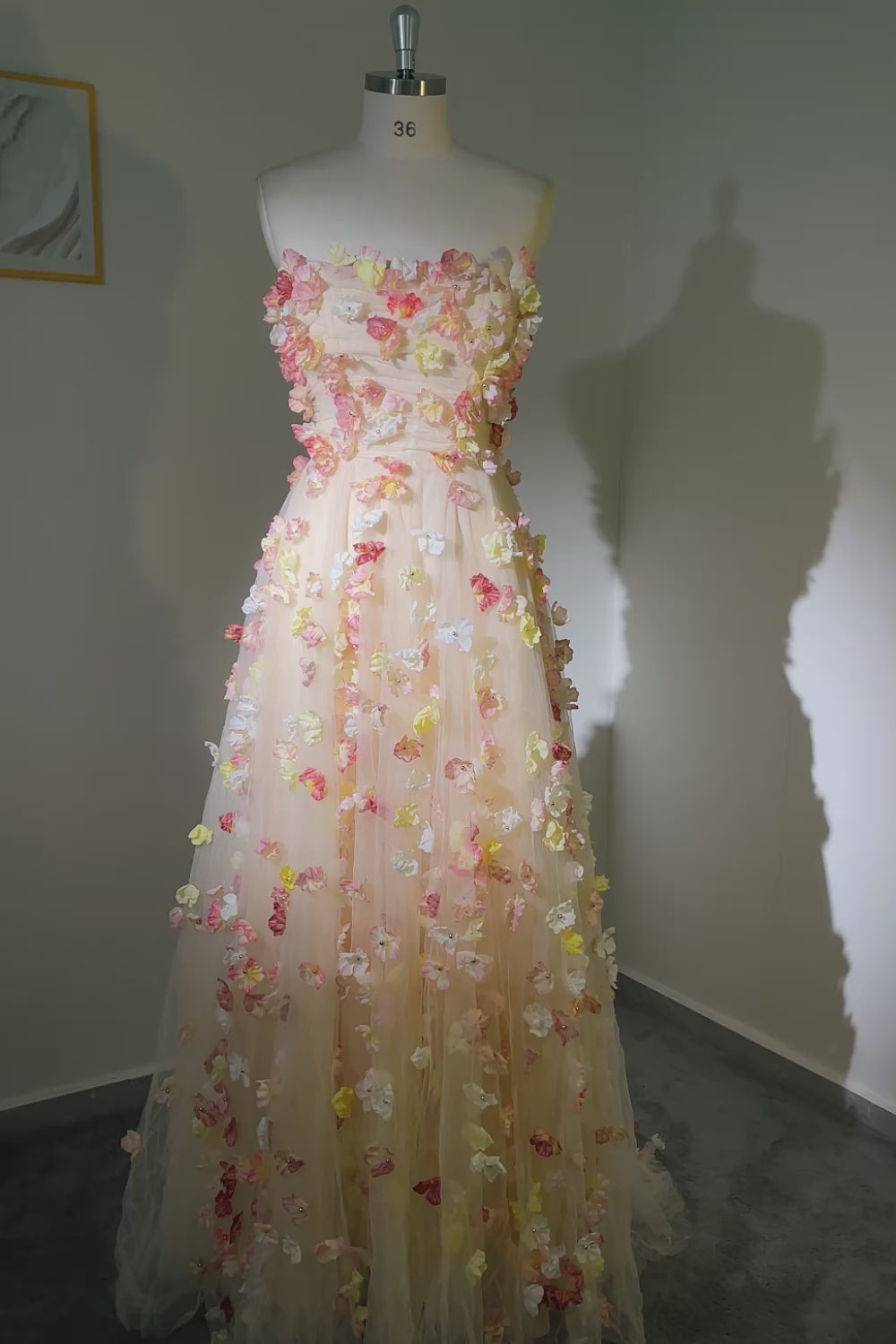 Champagne Strapless A Line 3D Flowers Tulle Long Prom Dress with Removable Sleeves