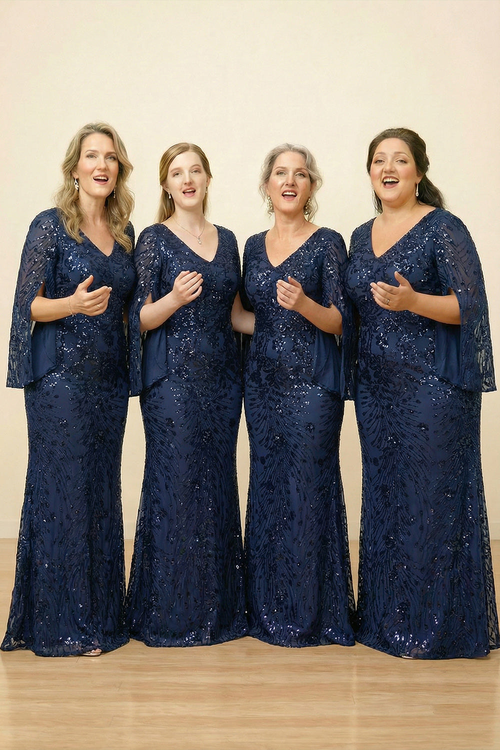 Glitter Navy Mermaid V Neck Sequins Long Choir Dress with Cape Sleeves